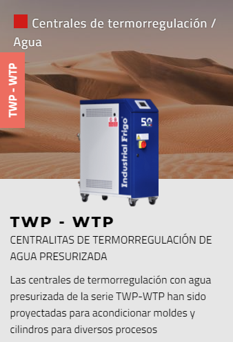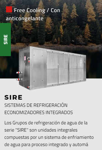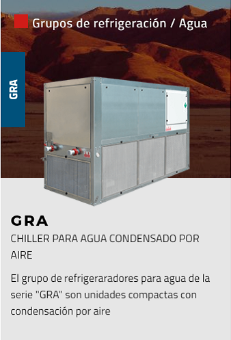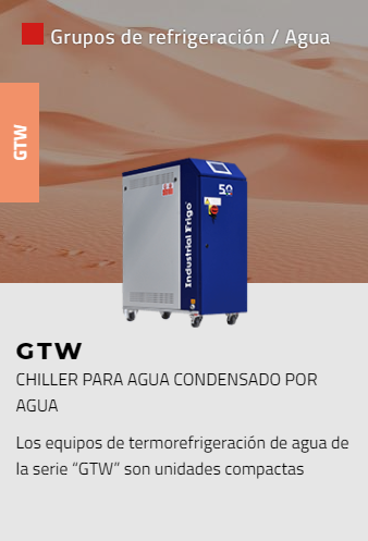 Amplia gama de enfriadores de agua con condensación por aire o agua, para instalación interior o exterior, caracterizados por su alta eficiencia y confiabilidad. Estas unidades se han diseñado para enfriar máquinas en la industria de plástico y caucho, pero se pueden usar para cualquier proceso industrial. Pueden funcionar en entornos críticos con temperaturas hasta 53 °C; las versiones condensadas por agua son adecuadas para combinar con torres de enfriamiento o enfriadores en seco.
